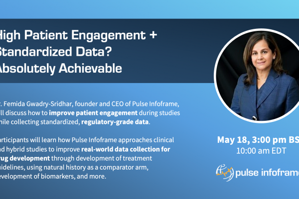 https://www.youtube.com/watch?v=KjYrIVdFG0c Dr. Femida Gwadry-Sridhar, Founder and CEO of Pulse Infoframe, discussed how to improve patient engagement during studies while collecting standardized, regulatory-grade data.