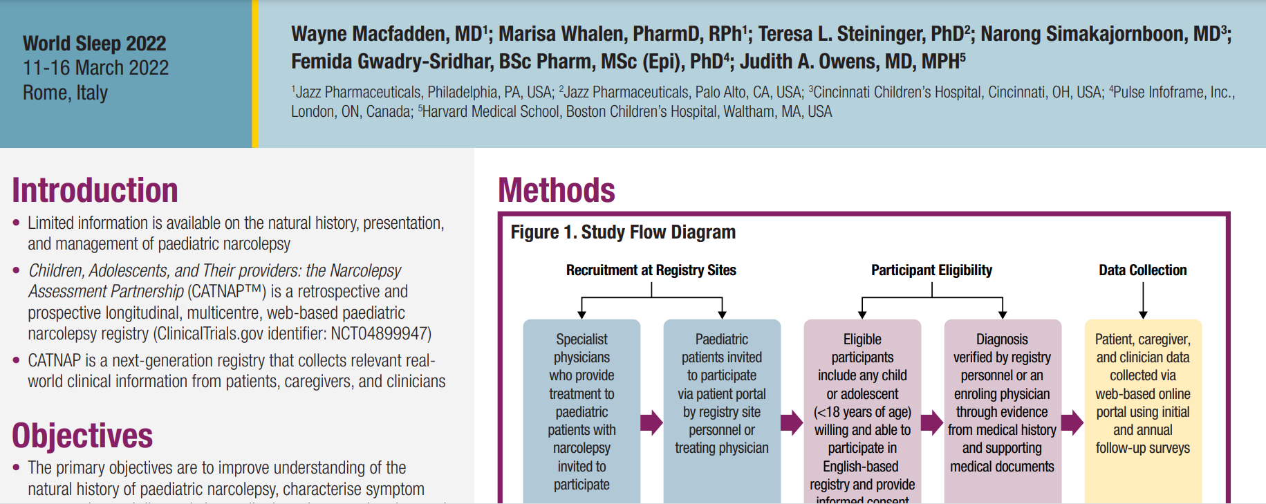 Children, Adolescents and their providers: The Narcolepsy Assessment Partnership (CATNAP)® will provide tools to fulfil all these unmet needs. The registry platform will have a patient portal and clinician/researcher portal to capture the relevant data and will provide collaborative and easy-to-use data analysis and visualization tools. Thus, the data collected through this initiative will add valuable scientific information and insight to the field of pediatric narcolepsy.